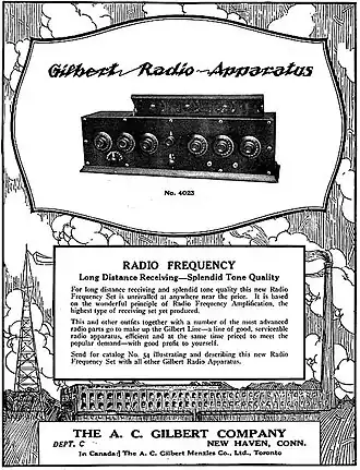 Founded in 1909, the A. C. Gilbert Company was a prominent toy manufacturer with a target audience consisting primarily of young boys, best known for its Erector Set construction sets. After War World One, the company briefly expanded into selling amateur radio equipment, offering "Superdyne" regenerative vacuum tube receivers designed by the C. D. Tuska Company.[3]