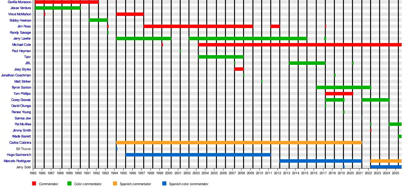 For five of the first six WrestleManias, Gorilla Monsoon and Jesse Ventura served as the color commentators (the exception being WrestleMania 2, which was split among three venues and had Monsoon, Ventura, and Vince McMahon split up with guest commentators), while Bobby Heenan, Gene Okerlund, Lord Alfred Hayes, and others filled guest roles. For WrestleMania VII and VIII, Monsoon and Heenan provided color commentary. In the mid to late 1990s, the commentator team comprised Vince McMahon, Jim Ross, and Jerry Lawler. Since the brand separation in 2002, matches from the Raw brand have been called by Ross and Lawler; the SmackDown matches called by Michael Cole, Tazz, John "Bradshaw" Layfield, and Jonathan Coachman, and from 2006 to 2010, the ECW matches called by Joey Styles and Tazz. At WrestleMania 25, the first three-man inter-brand commentary team since the brand extension was introduced was used and consisted of Jim Ross, Jerry "The King" Lawler, and Michael Cole. The following year at WrestleMania XXVI, Jim Ross was replaced by Matt Striker. At WrestleMania XXVII, Jim Ross returned to commentate, along with Josh Mathews and new SmackDown color commentator Booker T; the sudden change of commentary was due to a singles match between regular commentators Michael Cole and Lawler. Howard Finkel, who is credited with coming up with the name "WrestleMania" in 1984,[13] has served as the long-standing ring-announcer and has appeared at every event except WrestleMania 33, but since the introduction of the WWE brand extension, Lilian Garcia, Tony Chimel, and Justin Roberts took over as announcers for their respective brand's matches. Four French commentators were at ringside: Jean Brassard and Raymond Rougeau (WrestleMania 13), Phillippe Chéreau, and Christophe Agius (WrestleMania XXX, WrestleMania 31, WrestleMania 32, and WrestleMania 33).