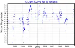 Evelyn Leland discovered that the star is a variable star based on observations done in the last decades of the 19th century, when it was known as BD +00°939. The discovery was announced in 1895.[10] It was listed with its variable star designation, W Orionis, in Annie Jump Cannon's 1907 work Second Catalog of Variable Stars.[11] W Orionis is a semiregular variable with an approximately 212‑day cycle.[5] A long secondary period of 2,450 days has also been reported.[12]
