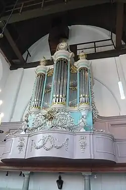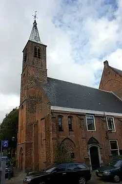 The Waalse kerk is a Walloon church that was built in the middle of the 14th century and has an upper gallery built for the Beguines who lived there on the courtyard that still bears their name.[1] The sacristy dates from the 16th century, with wooden arches and a mantel from the 17th century.[1] The organ was built in 1808 by Friederichs, and in the attic, there is a mechanical clock that drives the hands on the clock of the organ.[1] In the church tower there is a bell from 1512 with a diameter of 56.5 centimeters.[1]