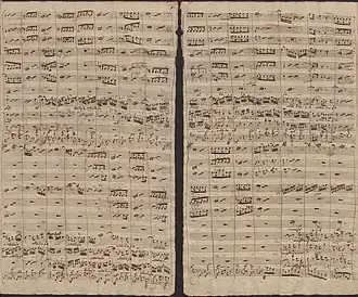 Bach structured the cantata in seven movements. The text and tune of the hymn are kept in the outer choral movements and the central movement, set as two chorale fantasias and a four-part closing chorale, which frame two sequences of recitative and aria.[6] Bach scored the work for three vocal soloists (soprano (S), tenor (T), bass (B)), a four-part choir, (SATB) and a Baroque instrumental ensemble of horn (Co), two oboes (Ob), taille (Ot), violino piccolo (Vp), two violins (Vl), viola (Va), and basso continuo including bassoon.[4][12] The heading of the original parts reads: "Dominica 27. post Trinit. / Wachet auf, rufft uns die Stime / â / 4. Voc. / 1. Violino picolo. / 2. Hautbois. / Taille. / Basson. / 2 Violini. / Viola. / e / Continuo. / di Signore / J.S.Bach."[13] The duration is given as 31 minutes.[6]