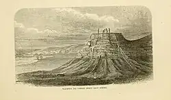 The Spring itself is a natural curiousity [sic], it being located on the summit of a cone shaped limestone rock. The rock is circular, about 200 feet in diameter at the base and about 30 feet high, upon the summit of this, rests the spring, the basin being circular and about 30 feet in diameter, its outlet is a trough apparently formed by the action of the water upon the rock. The water in the spring is about 20 feet deep and exceedingly strong with salt ...[4]