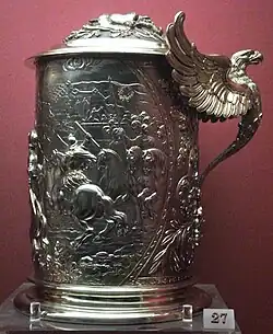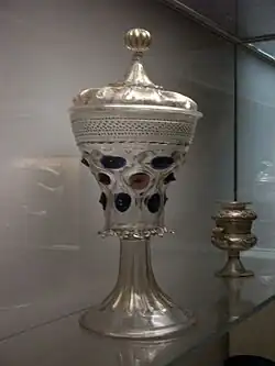 There are a number of standing cups with a cover, many from Augsburg and Nuremberg; these were used to drink a toast from to welcome a guest, and were also a common gift presented in politics and diplomacy, and by cities to distinguished visitors. Their decoration sometimes reflected the latest taste, often drawing from designs made as prints and circulated around Europe, but there was also often a very conservative continuation of late Gothic styles, which persisted until they came to be part of a Neugotic ("Neo-Gothic") revival in the early 17th century.[32] The largest object in the bequest with a specifically Jewish connection is a silver-gilt standing cup made in Nuremberg about 1600, but by 1740 belonging to a Jewish burial society in Bratislava, as a Hebrew language inscription records.[33]