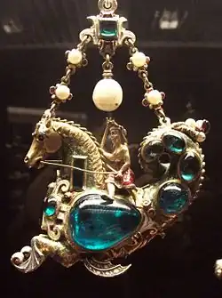 In a collection of Renaissance metalwork Benvenuto Cellini (1500–71) represents the ultimate attribution, as his genuine works as a goldsmith are rarer than paintings by Giorgione. In his 1902 catalogue Charles Hercules Read mentions that many of the pendants had been attributed to Cellini, but refrains from endorsing the attributions.[79] A small silver hand-bell (WB.95) had belonged to Horace Walpole, who praised it extravagantly in a letter as "the uniquest thing in the world, a silver bell for an inkstand made by Benvenuto Cellini. It makes one believe all the extravagant encomiums he bestows on himself; indeed so does his Perseus. Well, my bell is in the finest taste, and is swarmed by caterpillars, lizards, grasshoppers, flies, and masques, that you would take it for one of the plagues of Egypt. They are all in altissimo, nay in out-issimo relievo and yet almost invisible but with a glass. Such foliage, such fruitage!" However Baron Ferdinand had realized that it was more likely to be by Wenzel Jamnitzer, goldsmith to the Emperor Rudolf II, to whom it is still attributed.[80] Another piece no longer attributed to Cellini is a large bronze door-knocker, with a figure of Neptune, 40 cm high, and weighing over 11 kilos.[81]