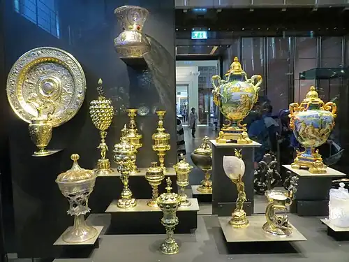 Much of the collection consists of luxury objects from the 16th century. Large pieces of metalwork in silver or silver-gilt make an immediate impression in the display, and these were designed to dazzle and impress guests when used at table, or displayed in rows on a sideboard with shelves like a modern bookcase or Welsh dresser.[29] Many are very heavily decorated in virtuoso displays of goldsmiths' technique; rather too heavily for conventional modern taste.[30] They are certainly ostentatious objects designed to display the wealth of their owner, and in many cases were designed to be appreciated when held in the hand, rather than seen under glass.[31]