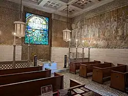 The wainscoting and ceiling are both made of white marble from Georgia.[7] The chapel features a massive stained glass window at the rear and mosaics on each side wall.[2]