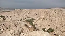 In its upper and middle reaches, it forms a steep ravine that receives the waters of several small tributaries. In its lower reaches, already on the plain, there has been a large well since ancient times, the Tawi Ribiyyah,[7][8][9] around which farms, agricultural holdings, and homes have expanded, forming the current village of Ribiyyah (Arabic: الرِّيْبِيَّة),[7] whose inhabitants retain a close connection with the mountain village of Slai Al-Ghalib.