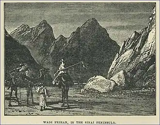 Wadi Feiran is an 81-mile (130 km) wadi on Egypt's Sinai Peninsula. Its upper reaches, around Jebel Musa, are known as the Wadi el-Sheikh.[3] It empties into the Red Sea's Gulf of Suez 18 miles (29 km) southeast of Abu Zenima.[1] Ptolemy identified the area as the site of Paran.[4] The nearby hill is the Tell Feiran.