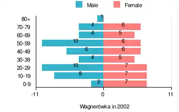 According to the 2002 Poland census, there were 98 people residing in Wagnerówka village, of whom 50% were male and 50% were female. In the village, the population was spread out, with 22.4% under the age of 18, 33.7% from 18 to 44, 25.5% from 45 to 64, and 18.4% who were 65 years of age or older.[1]