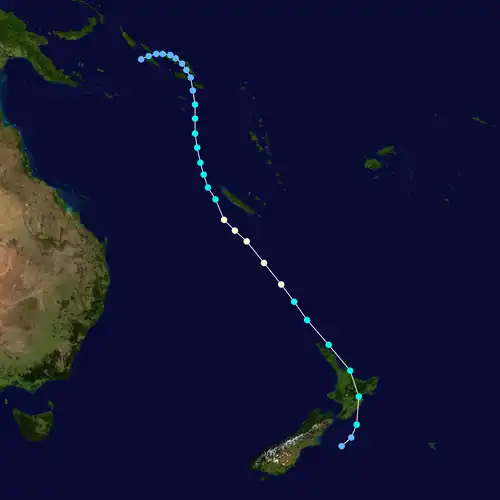 In the early morning of Wednesday, 10 April, two violent storms merged over Wellington, creating a single extratropical cyclone that was the worst recorded in New Zealand's history. Cyclone Giselle was heading south after causing much damage in the north of the North Island. It hit Wellington at the same time as another storm that had driven up the West Coast of the South Island from Antarctica.[13] The winds in Wellington were the strongest ever recorded there. At one point, the wind reached 275 km/h (171 mph) and in one Wellington suburb the wind ripped off the roofs of 98 houses. Three ambulances and a truck were blown onto their sides when they tried to go into the area to rescue injured people.