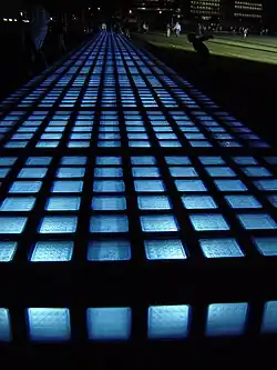 The generous park lawns invite you to take part in sport and games, to paddle in the water basin, and to take a stroll in the beech woods. The playing field, which is uncharacteristically open for the surrounding area, compromises four distinct functional elements: a vast sculpt-tural lighting mast, a robust ball stop net, a paddling pool with a wide concrete rim and a shade structure, all of which offer a contrast to the monochrome lawn. At night, the 160 m long seats are lit in a romantic blue colour with 7000 glass stones and change the park into a fairytale place.[4]