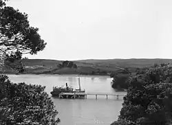The first wharf on Waiake Beach was constructed circa 1880 by the Cholmondeley-Smith family, and ferries were the major means of transport well into the 1920s.[42] Waiake Beach became known as McGowan's Beach in the early 20th century, after Scottish resident Anstruther McGowan, who periodically lived in Waiake between 1908 and 1936.[43][44]