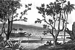The American missionaries Asa Thurston, Artemis Bishop, Joseph Goodrich and English missionary William Ellis toured the island in 1823 and planned to establish a network of several posts.[2] The first two were Mokuaikaua Church in the Kona District (western coast), and this one on the east side. On May 19, 1824, a simple grass hut was dedicated as the first church of the American Board of Commissioners for Foreign Missions with Joseph Goodrich as preacher and Samuel Ruggles as teacher.[3] The Hawaiian village at the time was called Waiākea, in the district called Hilo. The name of the village came from wai ākea in the Hawaiian language meaning "broad waters",[4] and was located in what is now the southeast part of the city of Hilo.