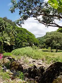 Waimea Valley is an area of historic cultural significance on the North Shore of Oahu, Hawaii. The valley, being an important place in Hawaiian religion, includes several historical structures including stone terraces and walls constructed during the time of the Hawaiian monarchy. The nutrient-rich volcanic soil combined with a rainy environment provided the resourceful Hawaiians of the area the opportunity to create one of the most prosperous farming communities in all of Polynesia. The area had complex fish ponds, domesticated animal pens, various large farming beds, and was famous for the cultivation of pink taro root stock, a coveted item to the Ali`i (the Hawaiian elite).[1][2] Much of the garden floor was once cultivated for taro, sweet potato, and bananas, with new crops and orchards introduced by Europeans after their arrival.