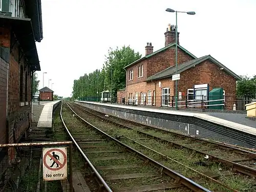 The station has its own signal box at the east end of the platforms, which is next to the level crossing.