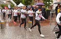 In the United Kingdom, the Soho Waiters Race in London, run by The Soho Society, has dated back to the 1950s, likely inspired by the French races due to Soho being a centre of French cooking in the city since the 19th century. Items that must be held on trays are a napkin, half a bottle of Prosecco (formerly Champagne), and a glass.[7] Around 50 people competed in its 2024 race with a first place prize of £100.[8] Other towns in the UK have adopted the race by switching out the coffee and croissant for pints of beer.[4]