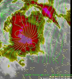 A wake low, or wake depression, is a mesoscale low-pressure area which trails the mesoscale high following a squall line.[1] Due to the subsiding warm air associated with the system's formation, clearing skies are associated with the wake low. Once difficult to detect in surface weather observations due to their broad spacing, the formation of mesoscale weather station networks, or mesonets, has increased their detection.[2] Severe weather, in the form of high winds, can be generated by the wake low when the pressure difference between the mesohigh preceding it and the wake low is intense enough.[3] When the squall line is in the process of decay, heat bursts can be generated near the wake low. Once new thunderstorm activity along the squall line concludes, the wake low associated with it weakens in tandem.