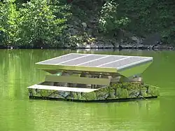Thereafter the leaseholders of the lake, Sinzheim Sports Fishing Club, with financial support from the municipality of Sinzheim 2014,[5] installed a solar-powered circulator pump, which pumps water from the lakebed to the surface.
