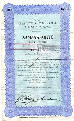 - ^ "Das Waldhaus Flims ist 69 Mio wert: FLIMS DORF - GR - Das Flimser Fünf-Sterne-Hotel Waldhaus hat einen Wert von 69,2 Mio. Fr. und ist mit Forderungen von total 40,8 Mio. Fr. konfrontiert. Diese Zahlen gehen aus dem Kollokationsplan hervor, der bis Anfang September aufliegt". Ringier AG (Blick-Gruppe), Zürich. 17 August 2015. Retrieved 31 October 2015.