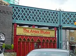 George Street is the location of an Italian restaurant, Giuseppe's, which later becomes an Indian restaurant, The Argee Bhajee, when a new owner takes over. Walford East tube station is on George Street,[7] which first appeared on screen in late 1985 when Lou Beale (Anna Wing) collapses outside it. On maps seen inside the station it replaces Bromley-by-Bow on the District line, although the building is in the style of the Bakerloo line stations designed by Stanley Heaps.[16] The train sound was first heard in 1987 and the train's first appearance was in 1988 at Lou Beale's funeral. Trains did not appear again until 4 February 2010, when CGI was used in the show for the first time.[17] Platforms within the station were first seen in 2011 when Charlie Slater (Derek Martin) left Walford. George Street also has a B&B, King George Guest House, which opened in 2008.