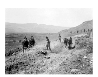 The irrigation system was the dominant factor for failure.[126] On the south shore, the creeks supplied water via 2 kilometres (1.2 mi) of wooden flume, 1.6 kilometres (1 mi) of ditch, 1.2 kilometres (0.7 mi) of wooden pipe, and 0.8 kilometres (0.5 mi) of steel pipe. On the north shore,[100] a similar combination stretched over 34 kilometres (21 mi).[127] An underwater pipe crossing the river to supplement the south shore irrigation was washed out two months after installation during the 1911 spring run off. The replacement was hung from a suspension bridge. When the pipe diameter was increased in 1914,[128] not only did the weight cause sag and leakage, but also prohibited use during high water. The total length of irrigation works was 102 kilometres (63 mi), which included the connecting lines to the orchards.[129]