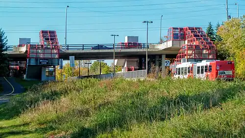Walkley station was originally planned to be part of the initial Trillium Line which opened in 2001, but it was cut for budgetary reasons before being added in the Stage 2 South expansion.[3] A passing loop was added in 2013 just north of Walkley to increase train frequency and line capacity.[4] Despite being single-tracked, the City of Ottawa has maintained that double-tracking the station is in its long-term plans.