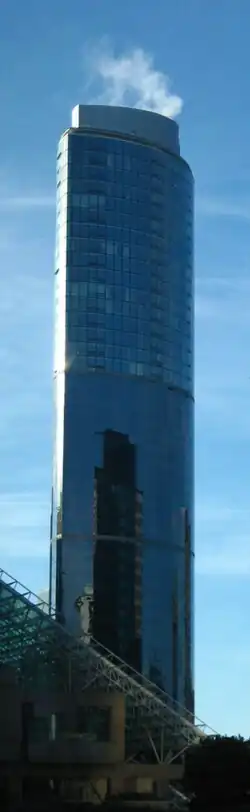 Wall's most famous building is One Wall Centre, part of the Wall Centre Complex in downtown Vancouver. Completed in 2001, it has been called "the crowning achievement of his life's work".[31] The commissioned architect, Peter Busby, said that "Wall represents a dying breed — a client willing to take a risk to build a tower that will stand out".[32] The building became, however, the object of a legal battle between Wall and the city.[8]