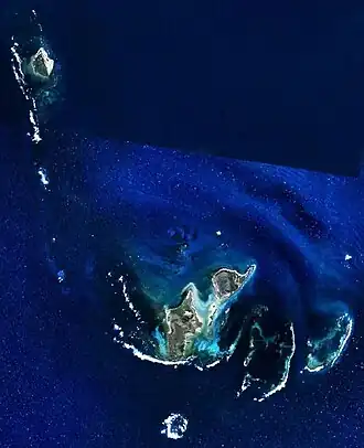 The group consists of a number of islands arising from a carbonate platform 17 kilometres (11 miles) long and up to 10 kilometres (6.2 miles) wide, and also the outlying North Island, located 14 kilometres (8.7 miles) to the northwest of the main platform. They are the most southerly well-established coral reef in the Indian Ocean.[3]: 3 The main islands are North Island, West Wallabi Island, East Wallabi Island, Long Island and Beacon Island.[2] The group is part of the Houtman Abrolhos Important Bird Area, identified as such by BirdLife International because of its importance for supporting large numbers of breeding seabirds.[4]