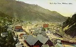In the spring of 1884, Colonel William R. Wallace built a cabin at a site he called "Placer Center." A Civil War veteran, Wallace was heavily involved in mining ventures after the war.[6][7] The spot's central location in the mining district clearly offered promise as a town site. In fact, a news sheet published at the time extolled the town's favorable prospects because "it is on the Mullan Road, which is the main emigrant road on the Bitter Root divide." Wallace believed in his new venture and invested money to build access roads, put up lot fences and make other improvements. By the spring of 1885, Placer Center had a grocery store and several other small businesses. Within a year or so, there was also a general store, a sawmill, hotel and more.[8]