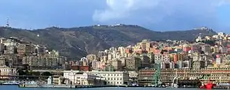 The view of Genoa from the sea is characterized by the line of New Walls with their fortifications, on the ridge of the hills, above the hilly quarters which grew after World War II; coming from the north, by train or car, the first visible structure is the mass of Fort Diamante, high on the mount on the left bank of the Val Polcevera, and the Fort Fratello Minore. Shortly after, on the ridge in the distance is Fort Begato, included in the line of bastions that rise up to the top of Mount Peralto, where sits Fort Sperone with its high walls.