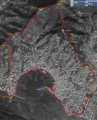 The walls of Genoa (mura di Genova in Italian, miage de Zena in Ligurian) constitute in their whole the several circles of walls that protected and defended the city of Genoa, former capital of the homonymous republic. To this day, large portions of these walls remain, and Genoa has more and longer walls than any other city in Italy.