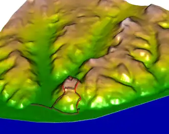 This lateral extension of the Cerca Moura runs for about 700 m parallel to the historic estuarine banks. The wall's base was up to 2.7 m wide and around 1.5 m wide above ground.[10] Construction materials were locally sourced limestone for the foundation and cemented aggregate above ground,[10] similar to the Cerca Fernandina.