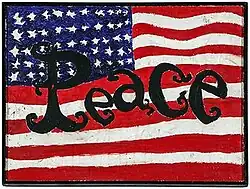 In 1953, one of the earliest paintings of his career as an artist presented a crumpled American flag defaced with the word 'Peace'. Thomas E. Crow contrasts this work with Jasper Johns’s "anonymous stenciling", drawing attention to the way Hedrick mimics the flamboyant calligraphy found in the decoration of hot-rod cars.[3] Crow sees the work in contrast to Johns's reticence, as a protest aimed against the waste of lives in Korea, and at Cold War adventurism in general.[3] Additionally, Peace (1953), "demonstrates an intuitive understanding of 'language as symbol' which predates the present postmodern use (of language) by twenty years.[29] Hedrick’s pre-pop paintings were included in John Coplan’s historical “Pop Art, USA," the first exhibition to attempt a collective look at the movement in the United States, presented at the Oakland Art Museum during September, 1963.[30] Even after his Pop Art phase, Hedrick continued "his risk-taking forays into regions where, mostly, angels fear to tread".[31]