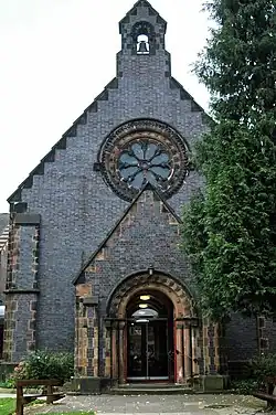 St Johns Church, built in 1845 to a design by D. R. Hill, is located on Walmley Road and is constructed of Staffordshire blue brick. It is the parish church for Walmley and is of a Norman architectural style. However, the building has been criticised in the past by authors such as Nikolaus Pevsner who criticised the lack of stone, and the use of industrial bricks in a religious building.[9] An extension to the church was built alongside it in the 1990s to house community facilities. It is an Anglican church in the Diocese of Birmingham.[10]