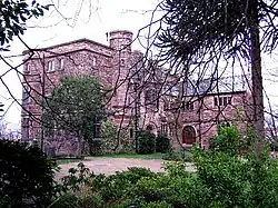 The house is built in red sandstone with a grey-green slate roof. It is Elizabethan in style and has a T-shaped plan. The main wing is elaborate and overlooks the river to the west; the unfinished servants' wing is simpler and looks to the north. The entrance faces the east. The entrance porch has two storeys with an arched entrance and an oriel window above it.[1] The room above the porch was used by Douglas as an oratory or chapel.[6] To the left is a squat three-storey tower and between the two is an octagonal corbelled stair-turret. To the right of the entrance porch the house continues for two bays leading to the servants' wing at right angles. These are in two storeys with mullioned windows.[1]
