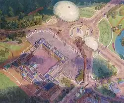 In 1918 Bayes was appointed Principal of the Westminster School of Art, a post he was to hold until 1934.[2] From 1927 to 1939 Bayes was a lecturer in Perspective at the Royal Academy Schools and when he left Westminster in 1934 he continued teaching as a visiting lecturer at Reading University until 1937.[6] Early in World War II Bayes submitted works to the War Artists' Advisory Committee for purchase but was refused.[11] In May 1942, however WAAC offered Bayes a short commission to produce a large oil painting on the subject of the air raids that had resulted in damage to parts of Buckingham Palace in 1940 and 1941. The resulting painting, Battle of Britain: Parachutists from an enemy aircraft brought down in an apparent attempt to bomb Buckingham Palace, led to further war-time commissions.[12] During the war Bayes was a prolific contributor to the Recording Britain scheme, producing numerous views of interior locations that often focused on leisure activities and people eating and drinking.[13] He produced 29 watercolours of London for the project, 23 of Essex and 20 of other areas, including seven drawings of Oxford.[14] In 1944 Bayes became Director of Painting at Lancaster School of Arts and Crafts, finally retiring in 1949, aged eighty.[6]