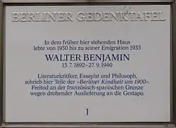 Walter Bendix Schönflies Benjamin (/ˈbɛnjəmɪn/ BEN-yə-min; German: [ˈvaltɐ ˈbɛnjamiːn] ⓘ;[6] 15 July 1892 – 26 September 1940[7]) was a German-Jewish philosopher, cultural critic, media theorist, and essayist. An eclectic thinker who combined elements of German idealism, Jewish mysticism, Western Marxism, and post-Kantianism, he made contributions to the philosophy of history, metaphysics, historical materialism, criticism, aesthetics and had an oblique but overwhelmingly influential impact on the resurrection of the Kabbalah by virtue of his life-long epistolary relationship with Gershom Scholem.[8][9][10][11]