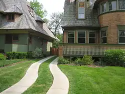 The house was designed by Frank Lloyd Wright in 1893 for Walter H. Gale, who was a member of one of Oak Park's "founding families" and a local hardware store operator. The house was the first design undertaken after he left Louis Sullivan's firm, Adler & Sullivan.[3][4] The house followed on in the nature of Wright's own home and was one of a series of modest homes designed in 1892 and 1893. Two of these homes were designed for Walter Gale on a speculative basis, the other being known as the Robert P. Parker House, which stand down Chicago Avenue from the Gale House.[5] The Gale House, like all of the homes designed in this "series," has symmetrical sides but they are difficult to see clearly because other buildings are built too closely.[5] The Gale House appears small but is quite roomy and it follows nearly identical plans to that of the other homes designed and built around 1893, though there are differences, most prominently in the roof profiles. It is currently a private residence.[5]