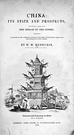 Medhurst served as a missionary in Penang in 1820, and then in Batavia (present-day Jakarta), capital of the Dutch East Indies in 1822.[2] His son Walter Henry was born that year and born in 1828 was his daughter Eliza Mary who went on to marry Hong Kong's chief magistrate Charles Batten Hillier in 1846.[3]: 183 [4] Their youngest daughter was Augusta, born in 1840.[5]