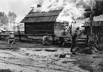 Members of an Order Police unit under Schimana's command attacking a village in the Soviet Union, 1942.