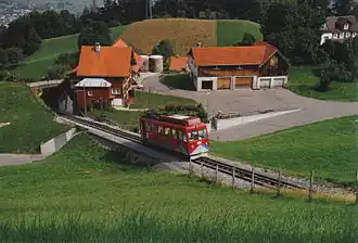 The Rheineck–Walzenhausen mountain railway, operating as S26 of S-Bahn St. Gallen, links Walzenhausen with Rheineck railway station located 272 m (892 ft) below on the Chur–Rorschach railway line. The S26 service operates one or two return journeys per hour, depending on the time of day, and offers connections at Rheineck with main line services (S-Bahn and InterRegio) to the city of St. Gallen and other towns. Local buses link Walzenhausen to Heiden and St. Margrethen.[5][6]