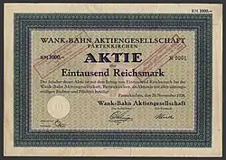 The Wank is linked to Garmisch-Partenkirchen by a cable car system called the Wankbahn, which usually operates between May and September during daylight hours.[2] Construction began in 1928 under the auspices of the Wank-Bahn AG and the cable car entered service in 1929.[3] It is 3 kilometres (1.9 mi) long and rises from 740 to 1,750 metres (2,430 to 5,740 ft) above sea level. The system has been upgraded several times since its opening. In 1960 its passenger capacity was increased from 125 to 210 persons per hour. A new Wankbahn was built in 1982, opening on 18 December, which increased the system's capacity to 1,000 persons per hour. Two 300 kW DC motors were installed to drive the cable.[4]