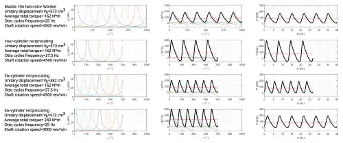 With this values, a single-rotor Wankel engine produces the same average power as a two-cylinder four-stroke engine, with the same average torque and the shaft running at the same speed, operating the unitary Otto cycles at 3/2 the frequency.