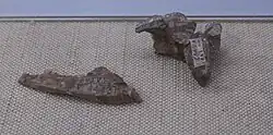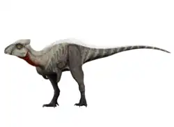 It is known from a single partial skeleton, including a partial skull roof and lower jaw, a femur and tibia, part of a rib, and other fragments. Because it has a flat skull roof with large openings, it has been considered primitive among pachycephalosaurs.[2][3] Sometimes it has been classified as a member of the now-deprecated family Homalocephalidae,[4][5] now thought to be an unnatural assembly of pachycephalosaurs without domed skulls.[3] Although its remains are from a very small individual, with a femur length of approximately 8 centimetres (3.1 in) and an estimated overall length of about 60 centimetres (2.0 ft),[2][6] the fused bones in its skull suggest that it was an adult at death.[7] Like other pachycephalosaurs, it was probably herbivorous or omnivorous, feeding close to the ground on a variety of plant matter, and possibly insects as well.[3]
