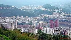 Wanzhou spans 30°24′−31°14′ N latitude and 107°55′−108°53′ E longitude, and is situated at the eastern edge of the Sichuan Basin. It reaches a maximal north–south extent of 67.25 km (41.79 mi) and east–west width of 97.25 km (60.43 mi), covering an area of 3,214 km2 (1,241 sq mi). Elevations range from 106 m (348 ft) in the town of Tailong (太龙镇) to 1,762 m (5,781 ft) at Shaping Peak (沙坪峰) of the Qiyao Mountains (齐曜山).[2] Bordering county-level divisions: