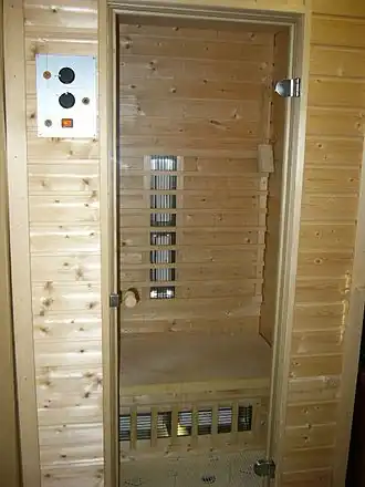 Infrared saunas can be designed to look like traditional saunas but cheaper models can be in the form of a tent with an infrared element inside.[1][4] Infrared saunas differ from other types of sauna such as traditional Finnish saunas mainly in the method of heat delivery. Far infrared light, which is emitted in an infrared sauna at a wavelength of around 10 μm, is felt directly by the body in the form of radiated heat without the need to heat the air around the body first.[5] This results in a lower ambient air temperature allowing for longer sustained stays in the sauna. Infrared light also penetrates the body deeply resulting in a fast and vigorous sweat being produced. The average ambient temperature in an infrared sauna is usually 40–60 °C (104–140 °F) compared to 70–90 °C (158–194 °F) in traditional saunas.[4]