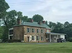 The stone addition exhibits two stories of deep verandas extending across its eastern front façade. These verandas were once supported by tall columns rising from the addition's ground-level porch, to the roof of the second-story porch. An exterior stairway once connected the lower porch to the upper porch.[35]