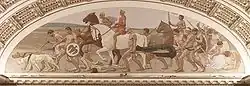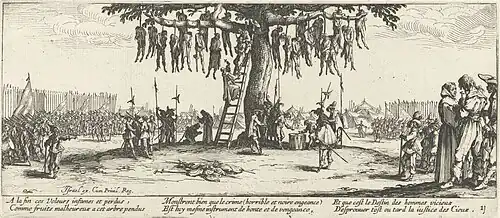 War usually results in significant deterioration of infrastructure and the ecosystem, a decrease in social spending, famine, large-scale emigration from the war zone, and often the mistreatment of prisoners of war or civilians.[76][77][78] For instance, of the nine million people who were on the territory of the Byelorussian SSR in 1941, some 1.6 million were killed by the Germans in actions away from battlefields, including about 700,000 prisoners of war, 500,000 Jews, and 320,000 people counted as partisans (the vast majority of whom were unarmed civilians).[79] Another byproduct of some wars is the prevalence of propaganda by some or all parties in the conflict,[80] and increased revenues by weapons manufacturers.[81]