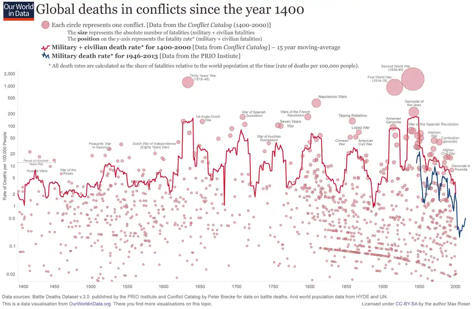 For the period 3000 BCE until 1991, estimates range from 151 million [60] to several billion.[61][62] The lowest estimate for history of 151 million was calculated by William Eckhardt. He explained his method as summing the recorded casualties and multiplying their average by the number of recorded battles or wars. This method excludes indirect deaths for premodern wars and all deaths for unrecorded wars. Few premodern wars were recorded beyond Eurasia and only 18 wars were recorded for period 3000 - 1500 BC worldwide.[63] Later researches shifted from Eckhardt's approach to general estimations of the percentage of population killed by wars. Azar Gat and Ian Morris both give the lowest estimate of 1% for history including all the 20th century,[64][65][66] or about 1 billion.[67] The highest estimates of both scholars exceed the famous "hoax" of 3,640,000,000 people killed in wars which circulated decades in scholarly literature in various countries.[68] Gat gives 5%,[69] or about 5 billion.[70] Morris gives for the 20th century 2%, for 1400-1900 3% in Europe and "slightly higher" elsewhere, 5% for the ancient empires in 500 BC - AD 200, 10% for the rest of history and 20% for prehistory.[71][72] His total for history is thus about 9 billion.[73]