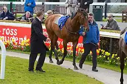 War Front is a bay horse bred by Joseph Allen and was foaled on February 11, 2002 at Claiborne Farm in Paris, Kentucky.[1][2] He was sired by Danzig, who won three minor races, but was then retired to stud undefeated as a result of knee problems. He went on to become a successful stallion and was champion sire of North America in 1991, 1992 and 1993. Amongst his other progeny are Chief's Crown, Dance Smartly, Danehill, Dayjur, Green Desert, Hard Spun and Lure.[3] War Front's dam is Starry Dreamer, a daughter of Rubiano who won six races and was placed in a number of graded races.[4] War Front was trained by H. Allen Jerkens.[5] At maturity he reached 15.3 hands (63 inches, 160 cm) high.[6]